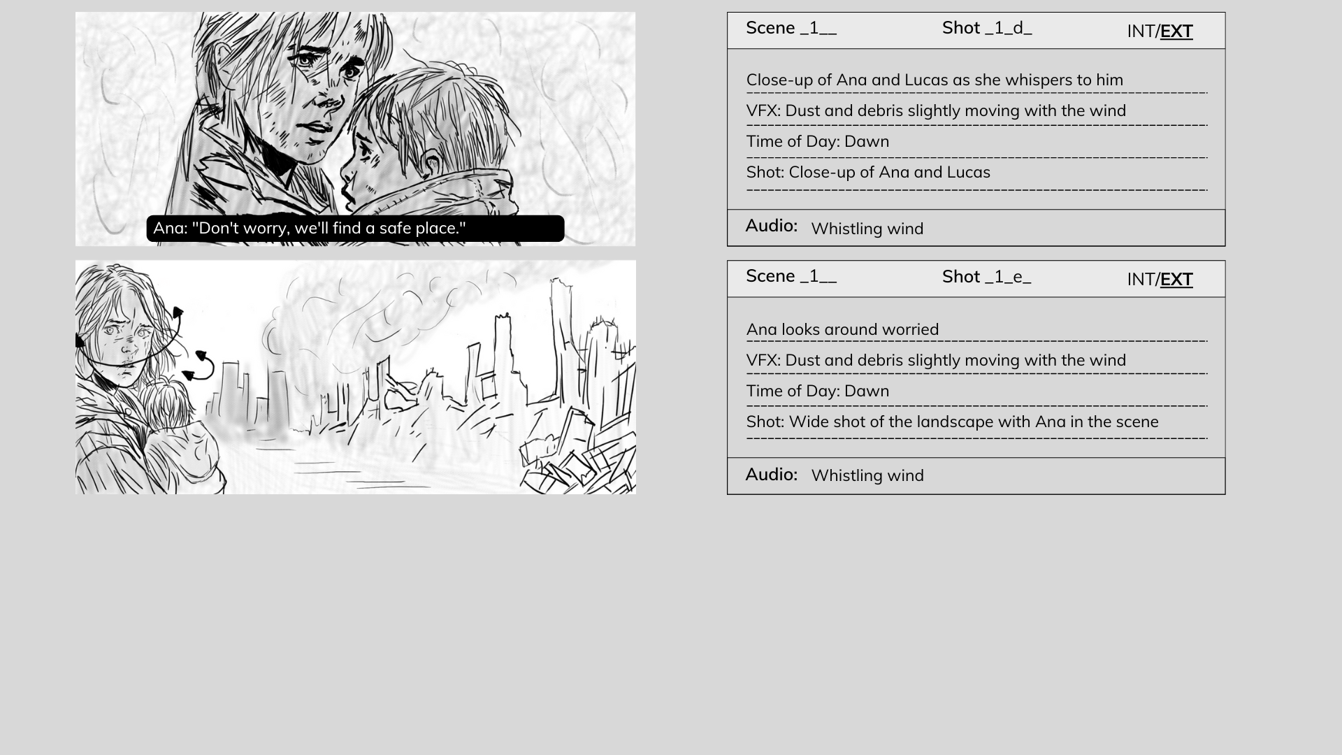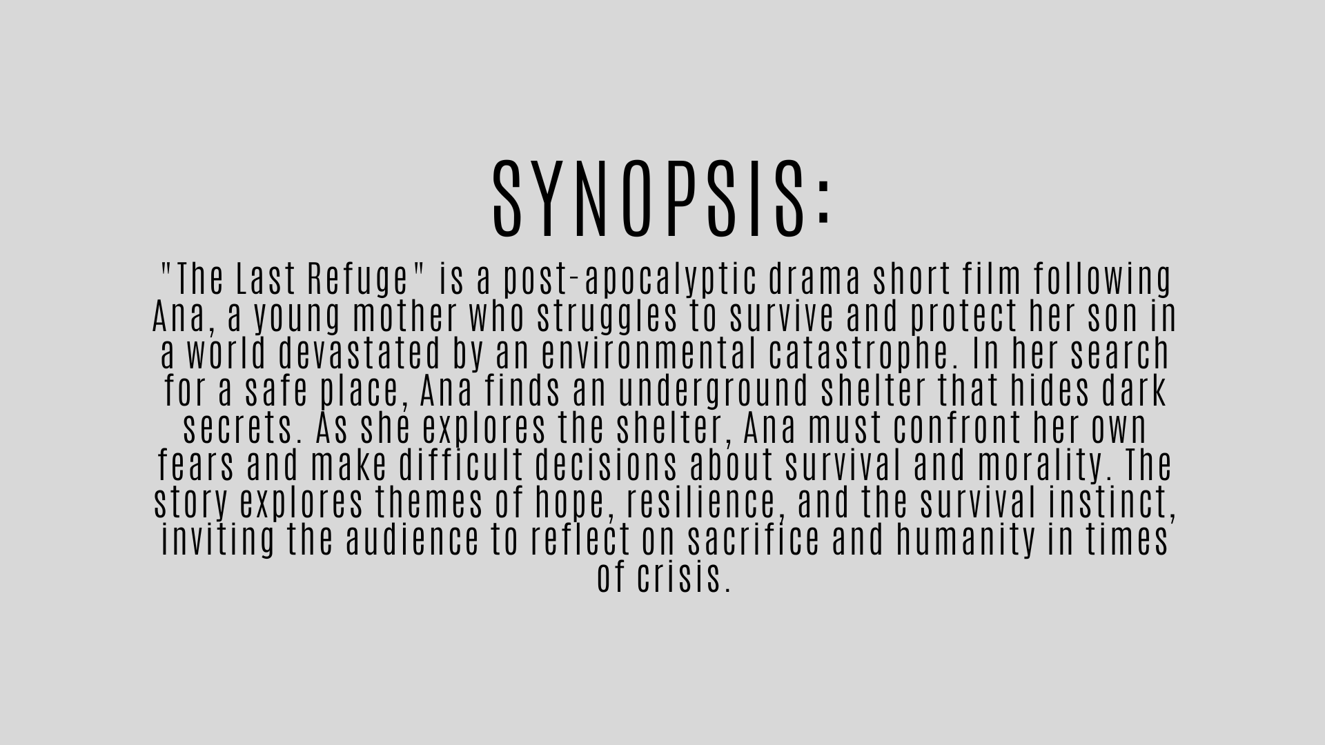 This project, created for the Virtual Production course at RTVE Instituto, focuses on developing a storyboard for The Last Refuge, a short film about Ana, a young mother in a post-apocalyptic world, as she discovers a mysterious underground shelter while trying to protect her son from dark secrets and the harsh realities of survival.